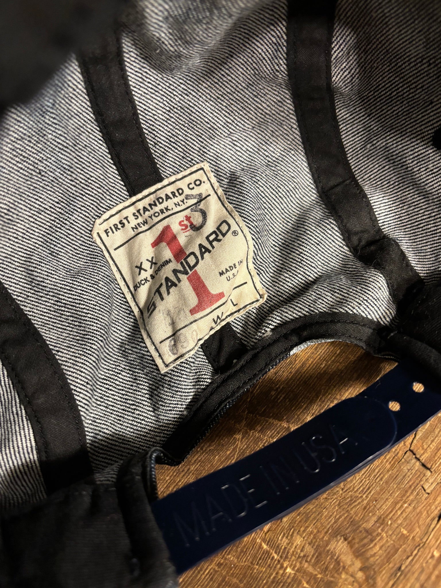 14oz Cone Mills selvedge denim five-panel cap made in Ridgewood, Queens, NY by Winners Cap Co., featuring First Standard front embroidery.