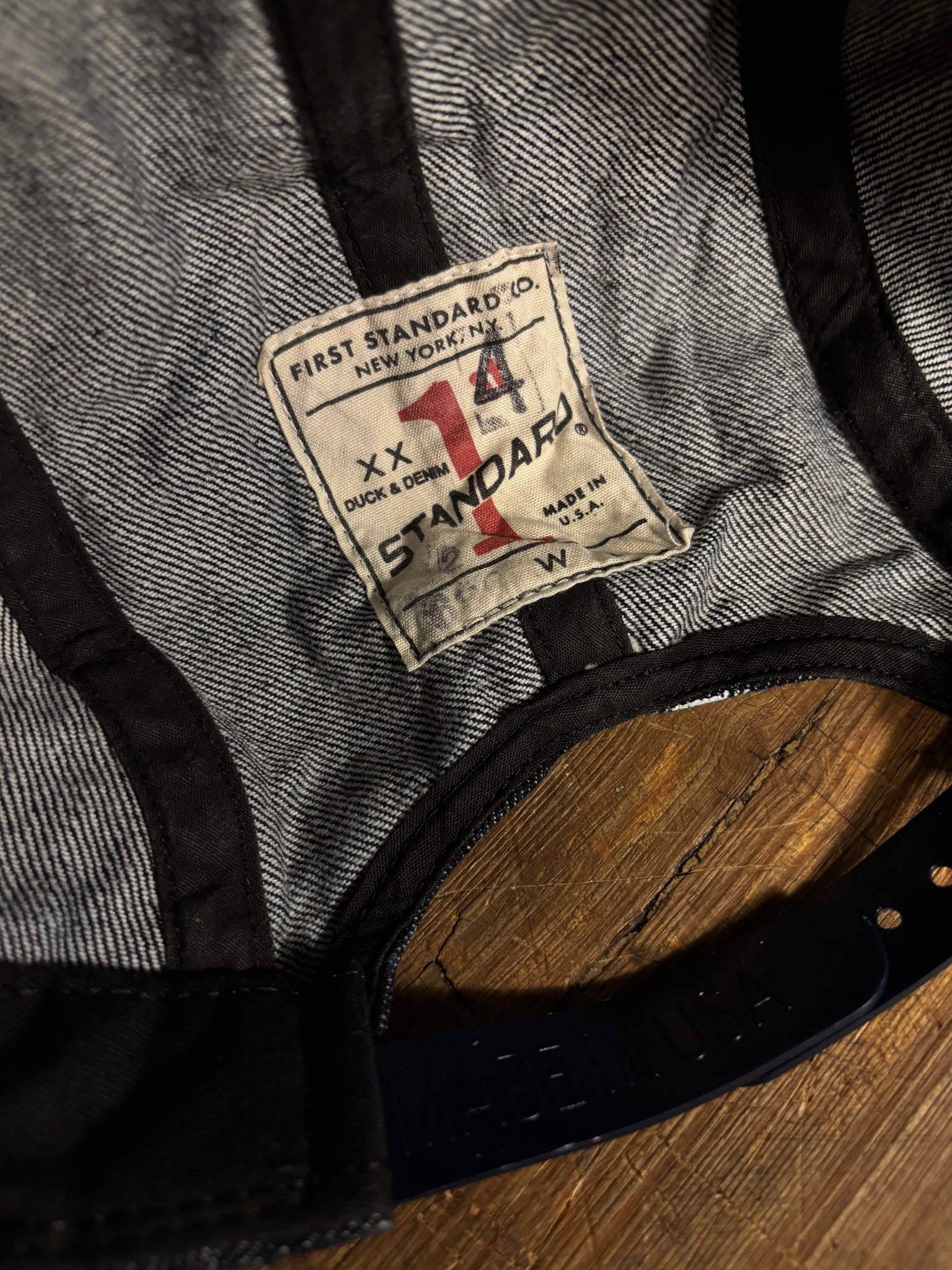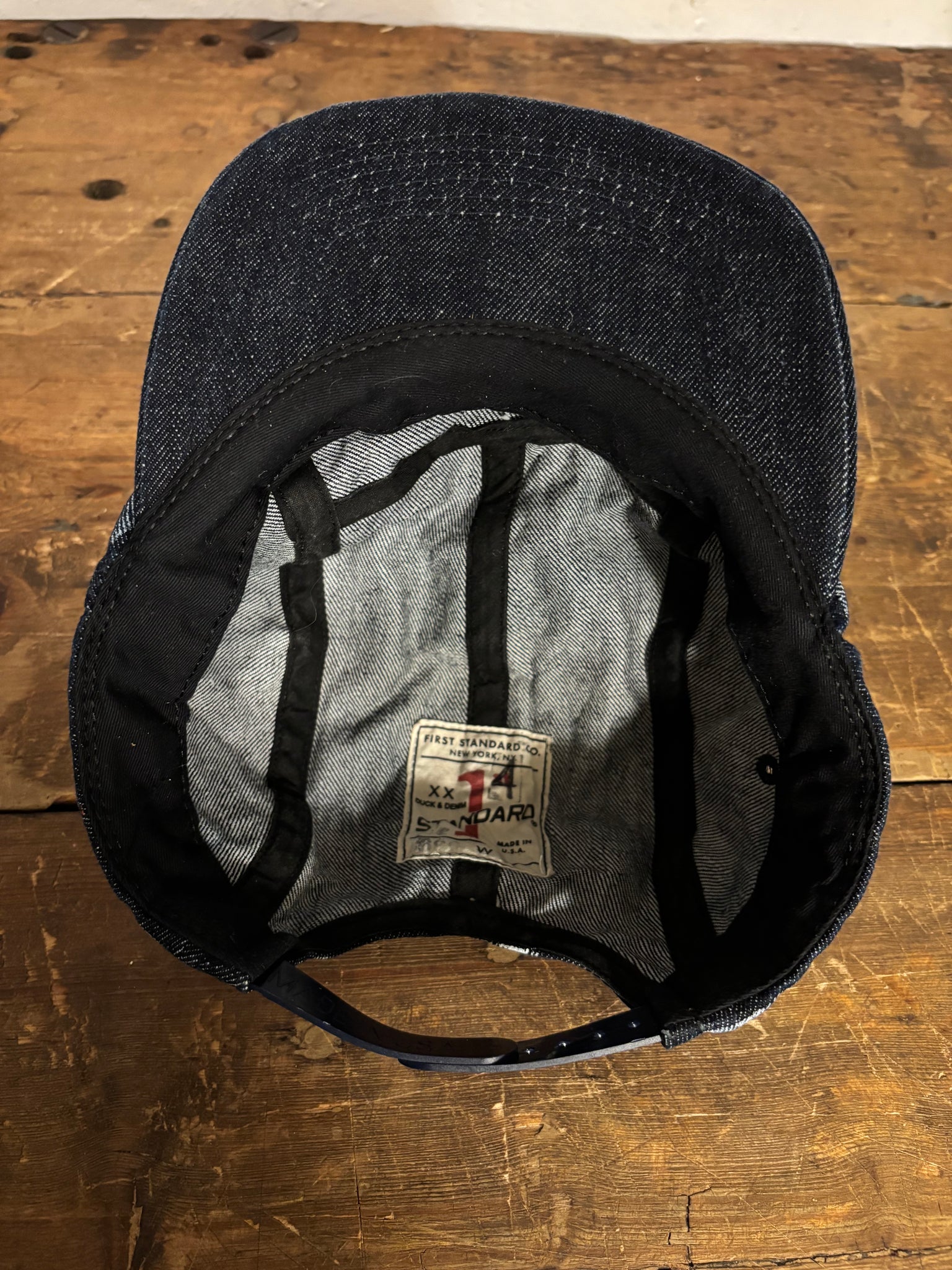 14oz Cone Mills selvedge denim five-panel cap made in Ridgewood, Queens, NY by Winners Cap Co., featuring First Standard front embroidery.