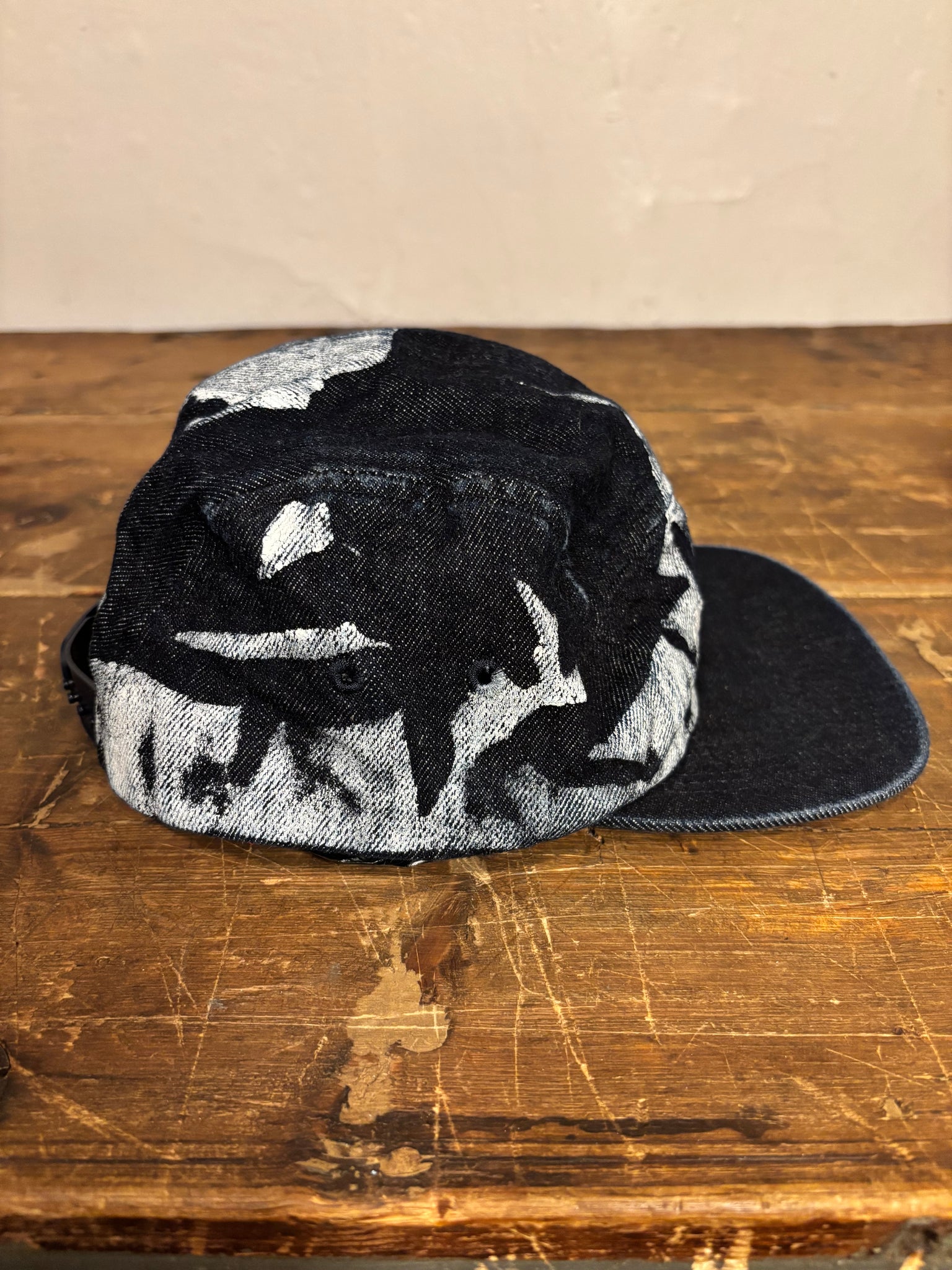 The form references 1990s crinkle nylon promotional caps reinterpreted here in selvedge denim through hand-set processes. Two embroidered eyelets on each side provide ventilation.