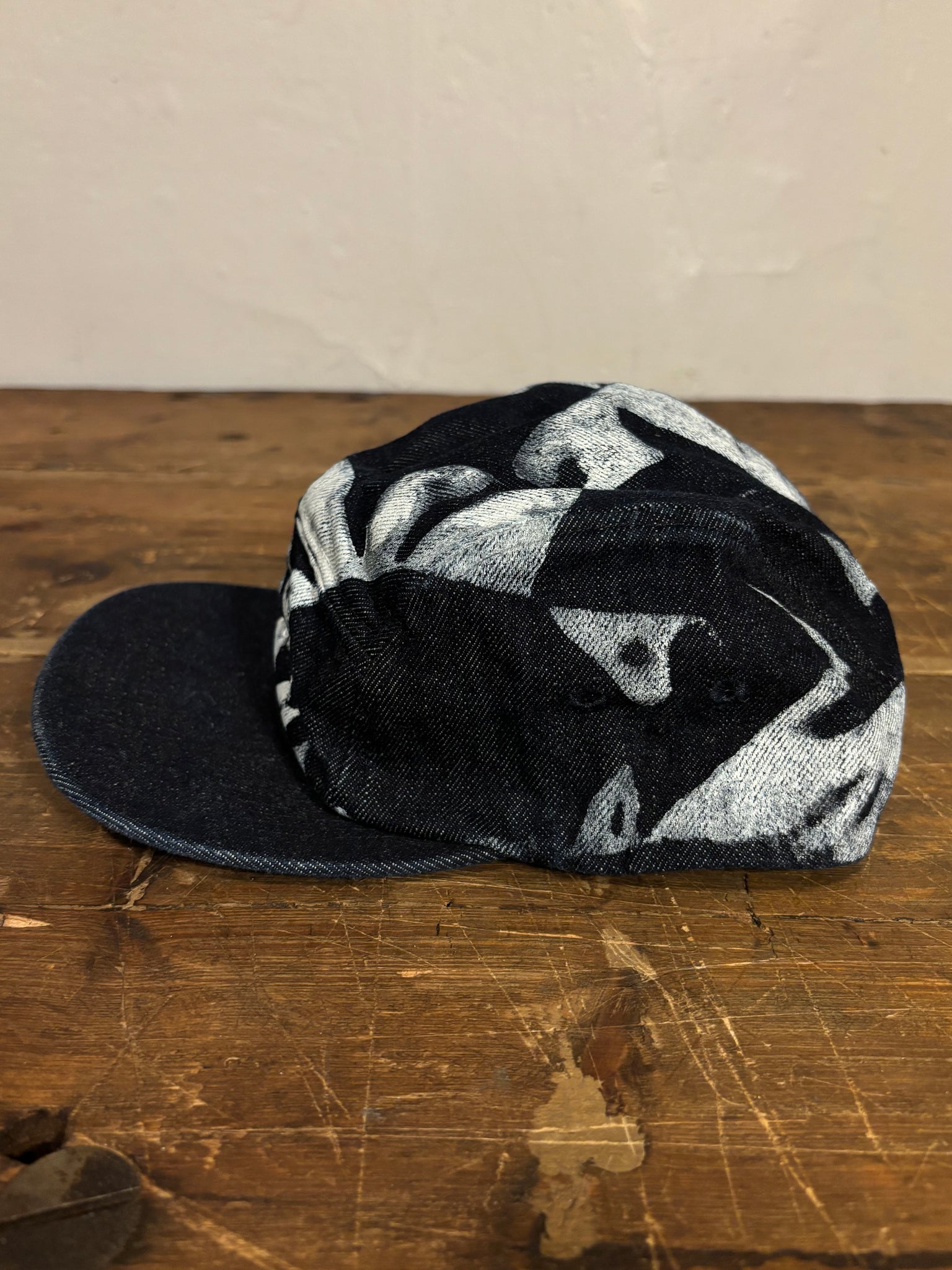 The form references 1990s crinkle nylon promotional caps reinterpreted here in selvedge denim through hand-set processes. Two embroidered eyelets on each side provide ventilation.