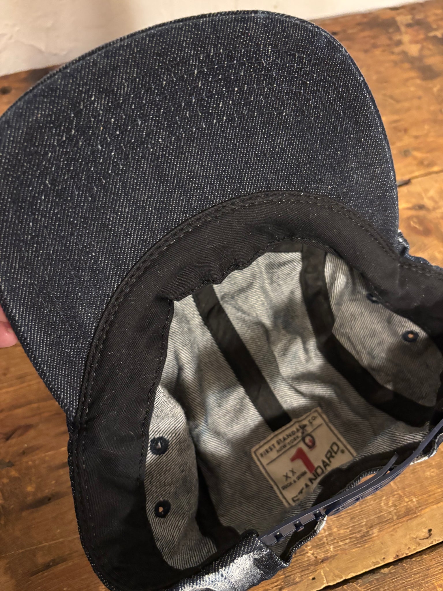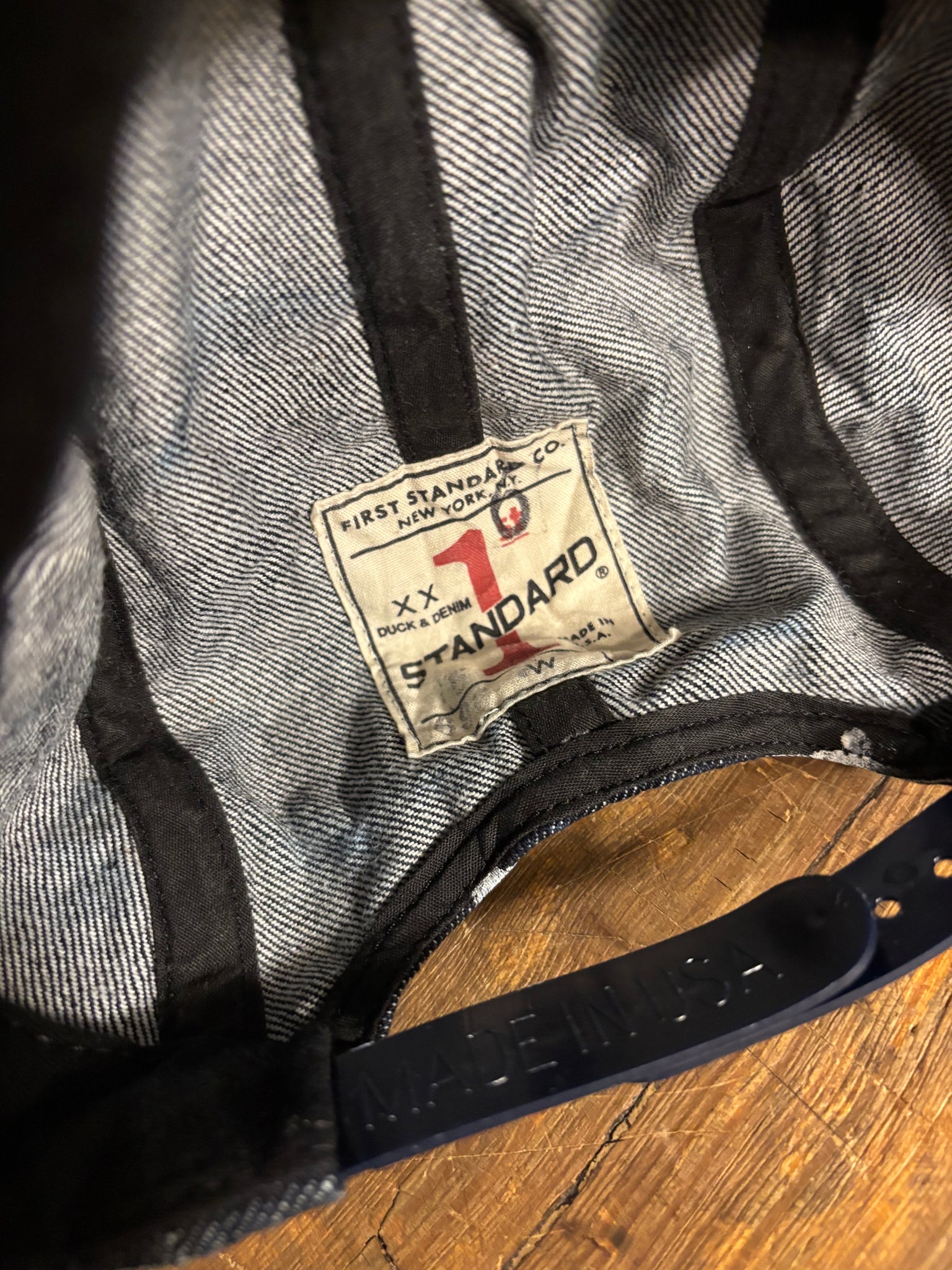 14oz Cone Mills selvedge denim five-panel cap made in Ridgewood, Queens, NY by Winners Cap Co., featuring First Standard front embroidery.